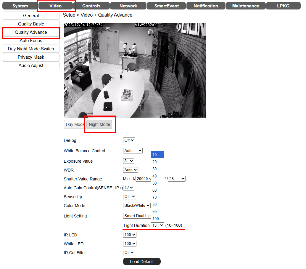 Setup --> Video --> Quality Advance --> Night Mode Tab (if required) - Adjust the light duration as required. Once you have adjusted the light duration, ensure you select Day Mode once again